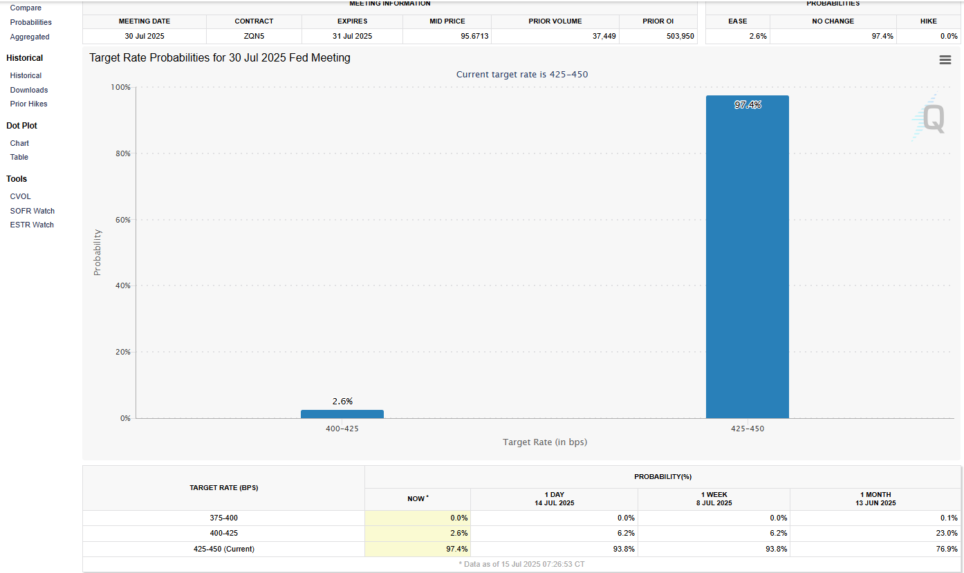 Voor de CPI-publicatie van juni toonde de CME FedWatch Tool dat rente-investeerders een kans van 95,3% voorspelden dat de Fed de rentetarieven ongewijzigd zou houden tussen 4,25% en 4,50% versus een kans van 4,7% om de tarieven te verlagen naar de 4,00% tot 4,25% range.