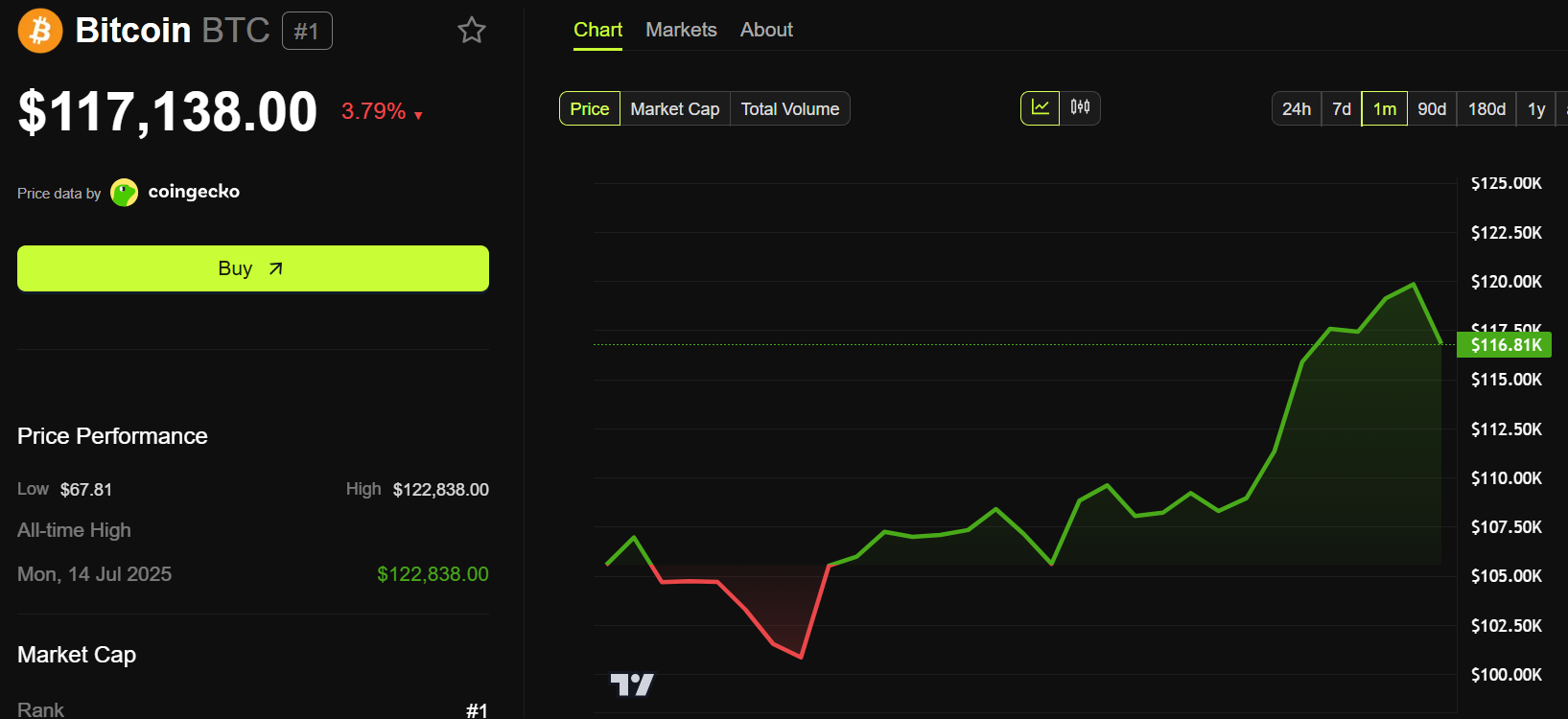 In de directe nasleep registreerde de Bitcoin koers een bescheiden stijging en handelde voor $117.138 op het moment van schrijven.