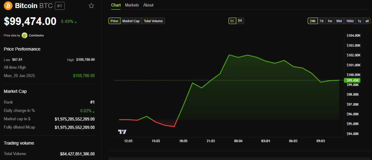 BeInCrypto gegevens tonen dat BTC op het moment van schrijven werd verhandeld op $99.474, een stijging van bijna 6% sinds de sessie op dinsdag begon.
