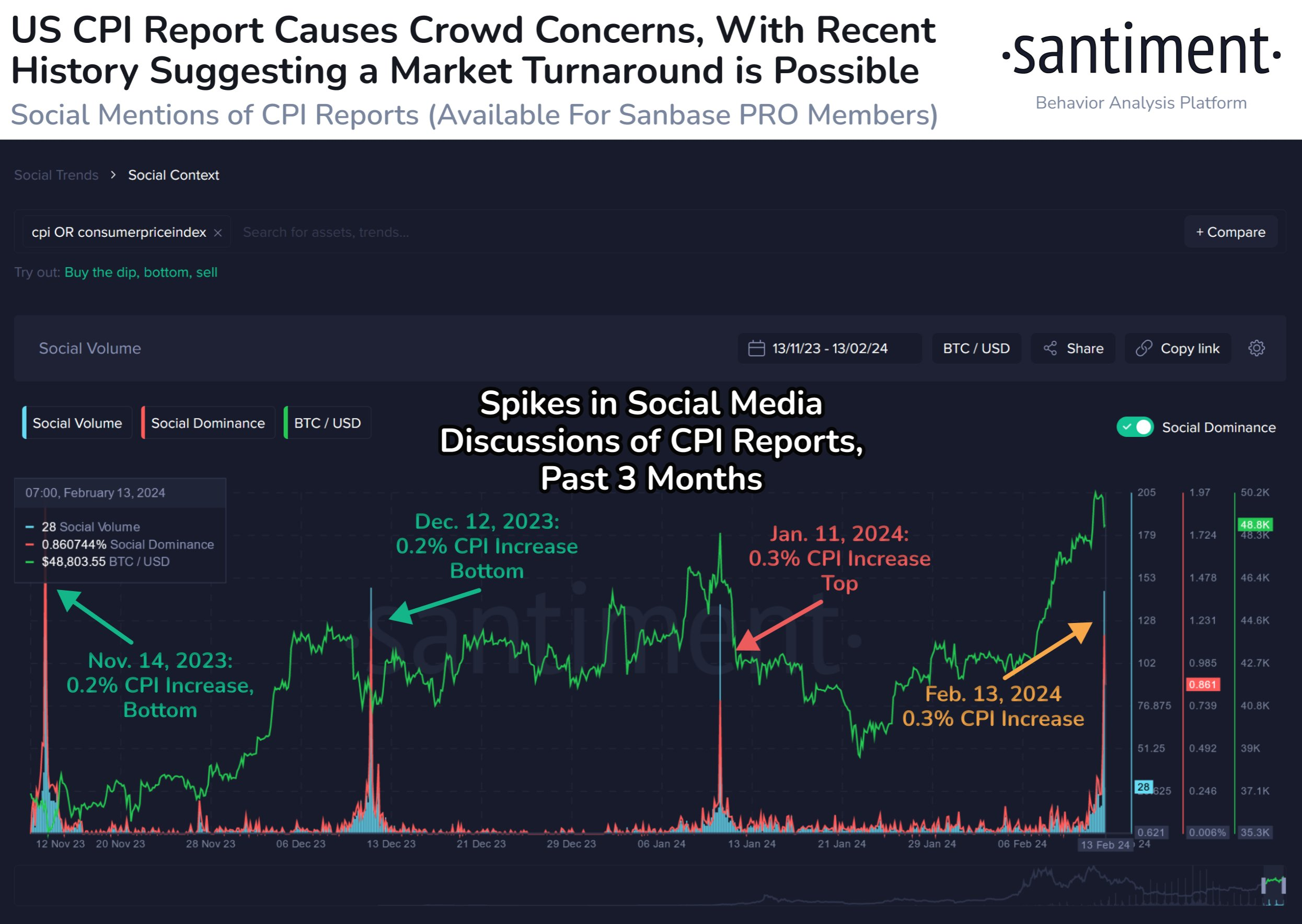 Blockchain analytics bedrijf Santiment bood een perspectief op de situatie, met aandacht voor de onverwachte CPI uitkomst en de impact ervan op de cryptocurrency en aandelenmarkten. Het bedrijf benadrukte het potentieel voor marktvolatiliteit en de mogelijkheid van een koopkans, mocht er paniek uitbreken. Het suggereerde dat eerdere CPI-rapporten hebben geleid tot sterke marktcorrecties op middellange termijn.