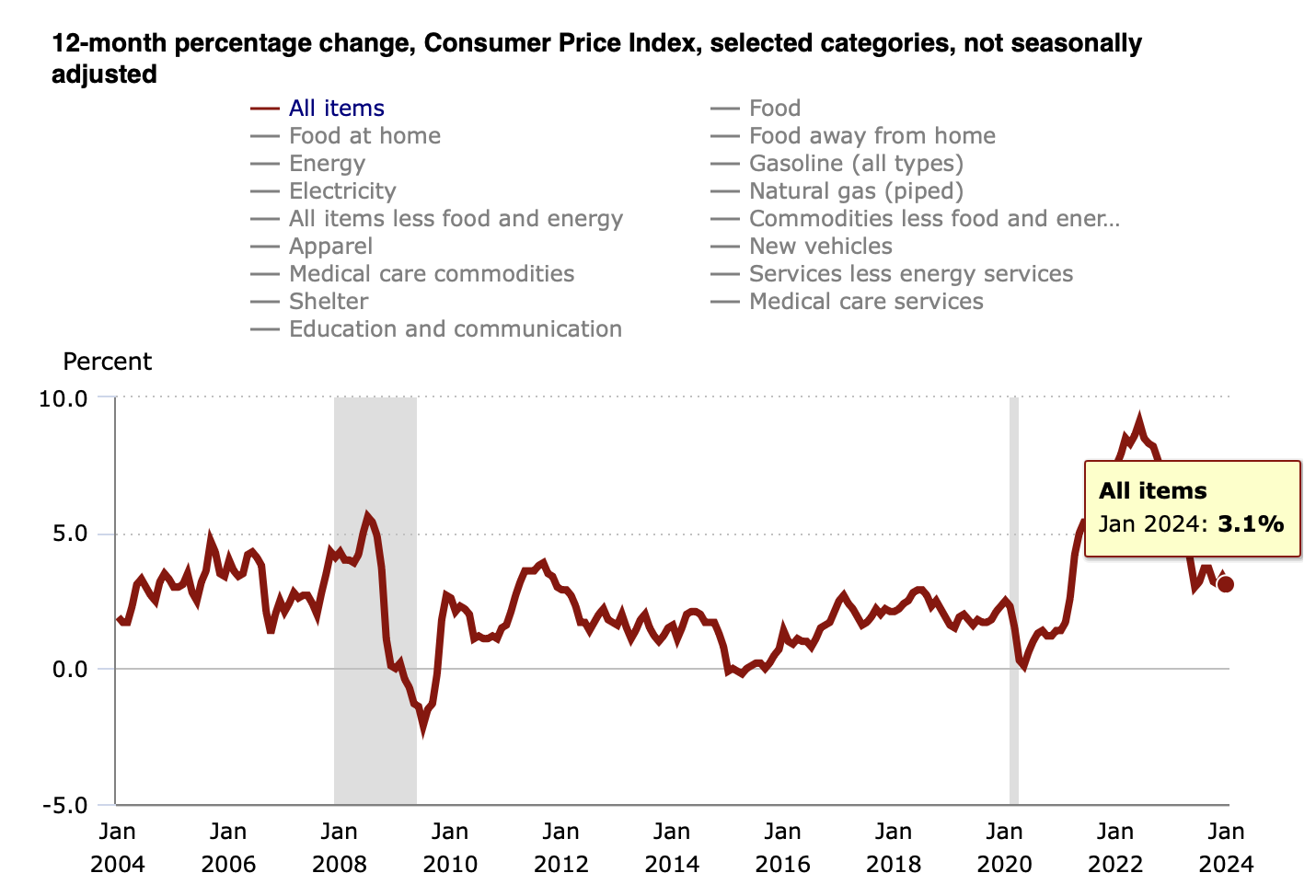 De index van consumentenprijzen (CPI) in de VS, exclusief voedsel- en energiekosten, steeg ten opzichte van december met 0,4%. Het was de grootste stijging in acht maanden en overtrof de verwachtingen van analisten. De CPI steeg op jaarbasis met 3,9% en handhaafde daarmee het percentage van de vorige maand.