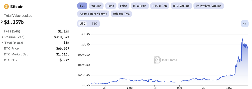 Momenteel staat de Bitcoin total value locked (TVL) op $1,137 miljard.