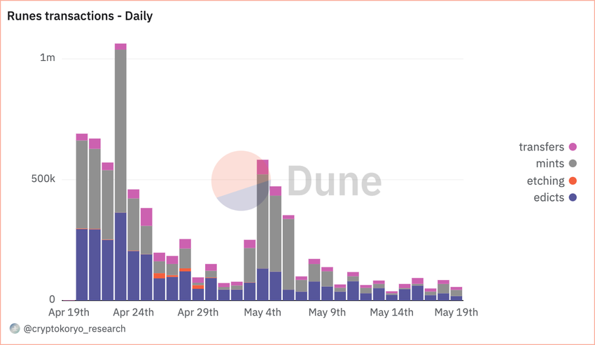 Op het hoogtepunt overschreed de Runes-transactie de grens van 1 miljoen op 23 april. Vanaf 19 mei is het aantal transacties echter gedaald naar 56.372.