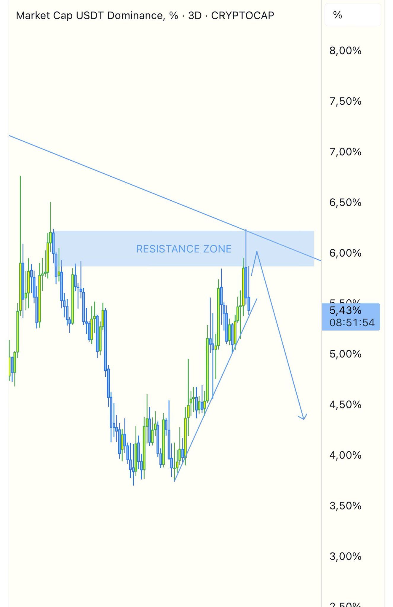 “USDT.D bevindt zich in een afwijzingszone, zolang het niet boven de 6,75% sluit, zal het gunstig zijn voor de markt,” schreef een technisch analist.