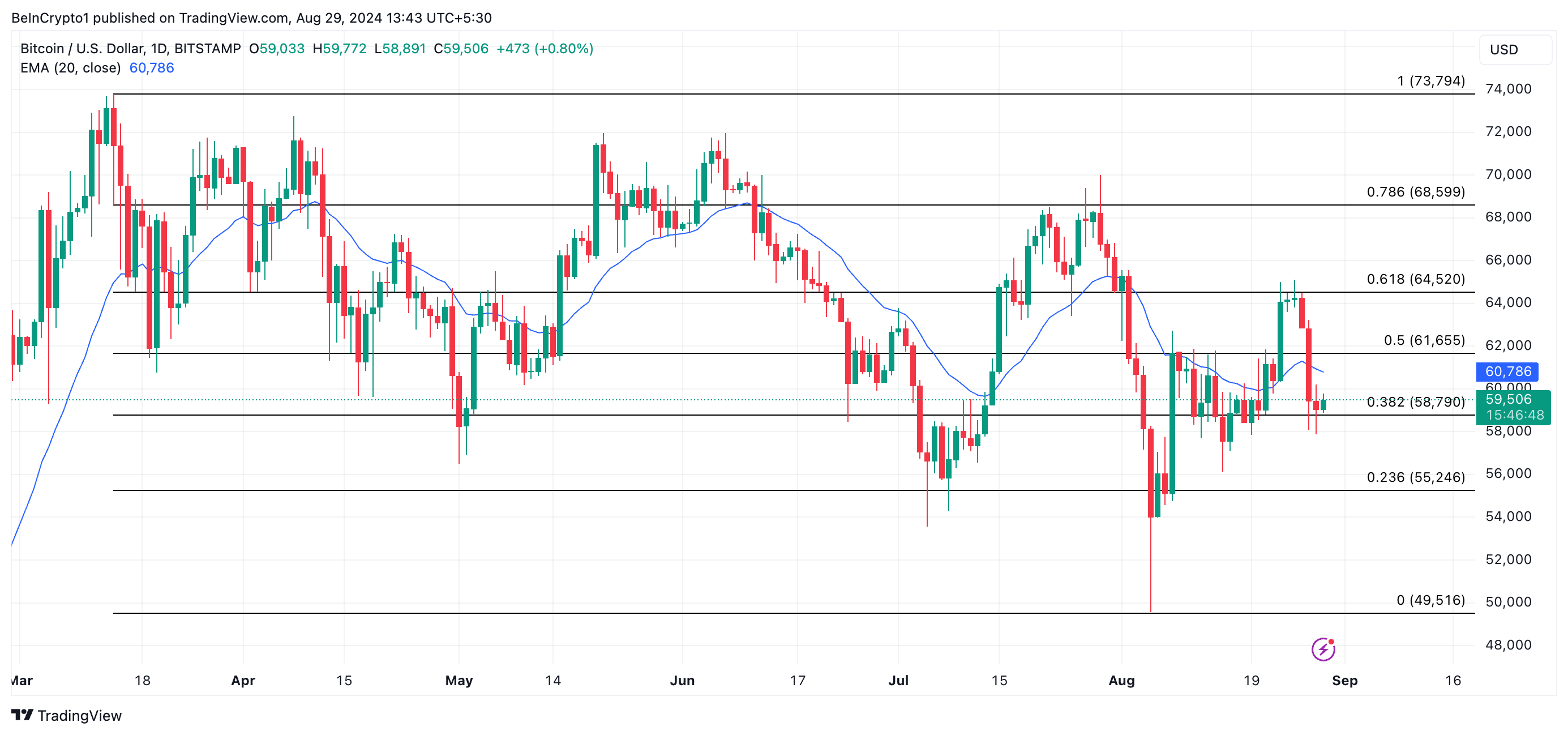 Op dit moment handelt Bitcoin onder zijn 20-daagse exponential moving average (EMA) van $59.640. Deze moving average, die de gemiddelde koers van de coin over de afgelopen 20 dagen weerspiegelt, is een belangrijke indicator van het marktsentiment.