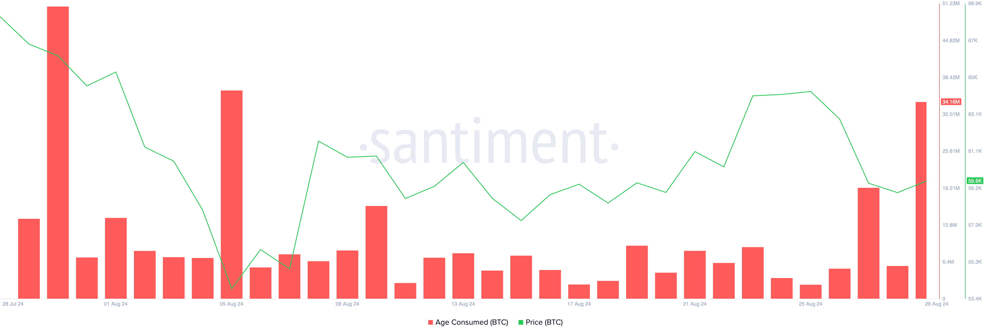 Volgens Santiment piekte de “age consumed” metriek van Bitcoin op donderdagochtend naar 34,16 miljoen, het hoogste niveau voor één dag sinds 5 augustus, toen een bredere marktdaling leidde tot meer dan $1 miljard aan liquidaties. De “age consumed” metriek meet de beweging van inactieve coins door de tijd te berekenen dat ze zijn vastgehouden voordat ze worden verplaatst, vermenigvuldigd met het aantal verplaatste coins.