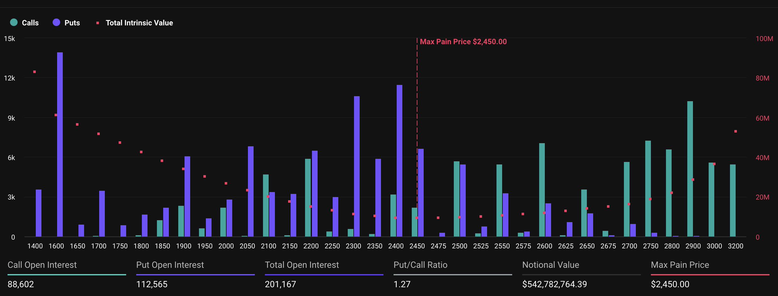 Voor Ethereum staat de maximale pijnprijs op $2.450. Ondanks dat het wordt verhandeld op $2.693, een stijging van 2,6% in de afgelopen dag, kan de markt nog steeds koersbewegingen richting het maximale pijnniveau zien naarmate de expiratie nadert.