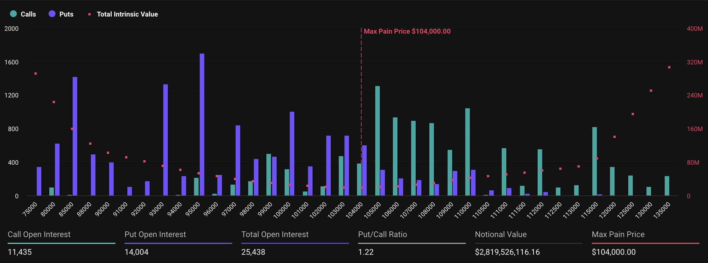 Voor Bitcoin is de maximale pijnprijs $104.000. Op het moment van schrijven werd BTC verhandeld op $110.787. Het bereikte een all-time high van $111.917 gisteren, maar is sindsdien ongeveer 1,0% gedaald vanaf zijn piek.