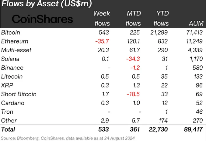 Na de goedkeuring in januari bereikte Bitcoin een nieuw all-time high boven de $73.000, terwijl Ethereum kort het psychologische niveau van $4.000 aanraakte. Volgens BeInCrypto blijft de vraag sterk, met crypto-investeringen ter waarde van $533 miljoen vorige week. Bitcoin leidde de instroom met $543 miljoen, terwijl Ethereum dalingen ondervond, deels door Grayscale klantterugbetalingen.