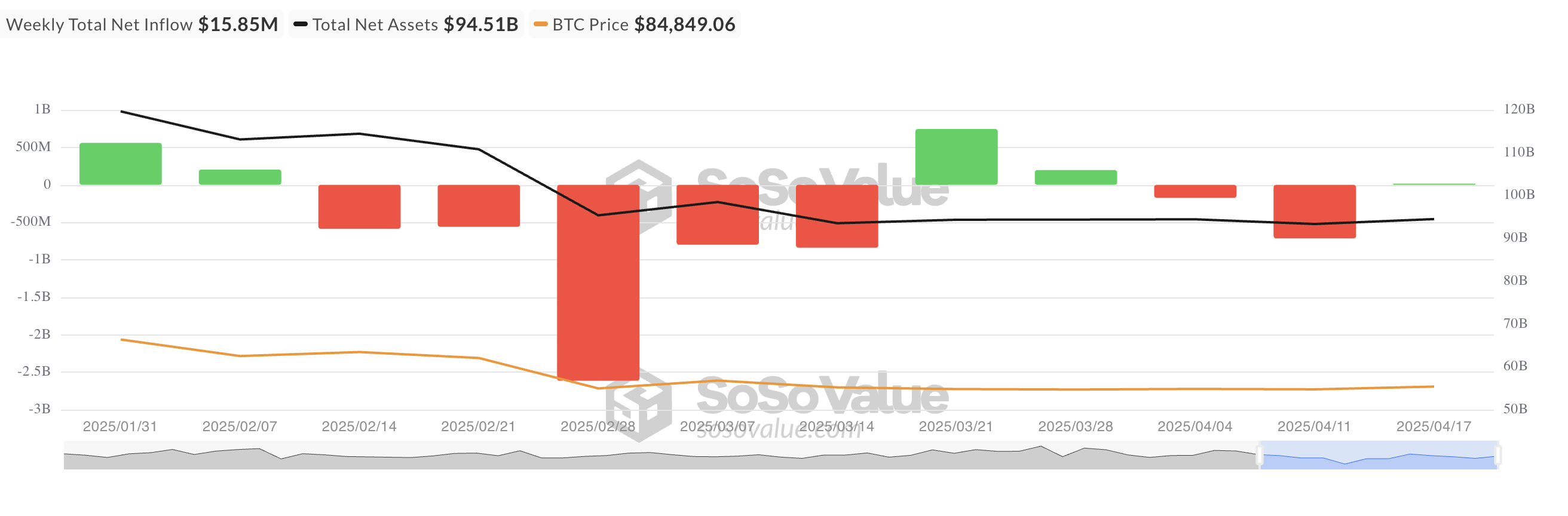 Vorige week, tussen 14 april en 17 april, voegden institutionele investeerders kapitaal toe aan BTC spot ETF’s, waardoor de netto-instroom in deze producten $15,85 miljoen bereikte.