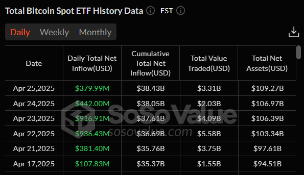 De grootste instromen werden gezien op 22 april en 23 april, toen de dagelijkse cijfers respectievelijk $936 miljoen en $916 miljoen bereikten. Analisten merkten op dat dit tot de beste prestaties op één dag behoorden sinds Donald Trump eerder dit jaar terugkeerde naar het Witte Huis.