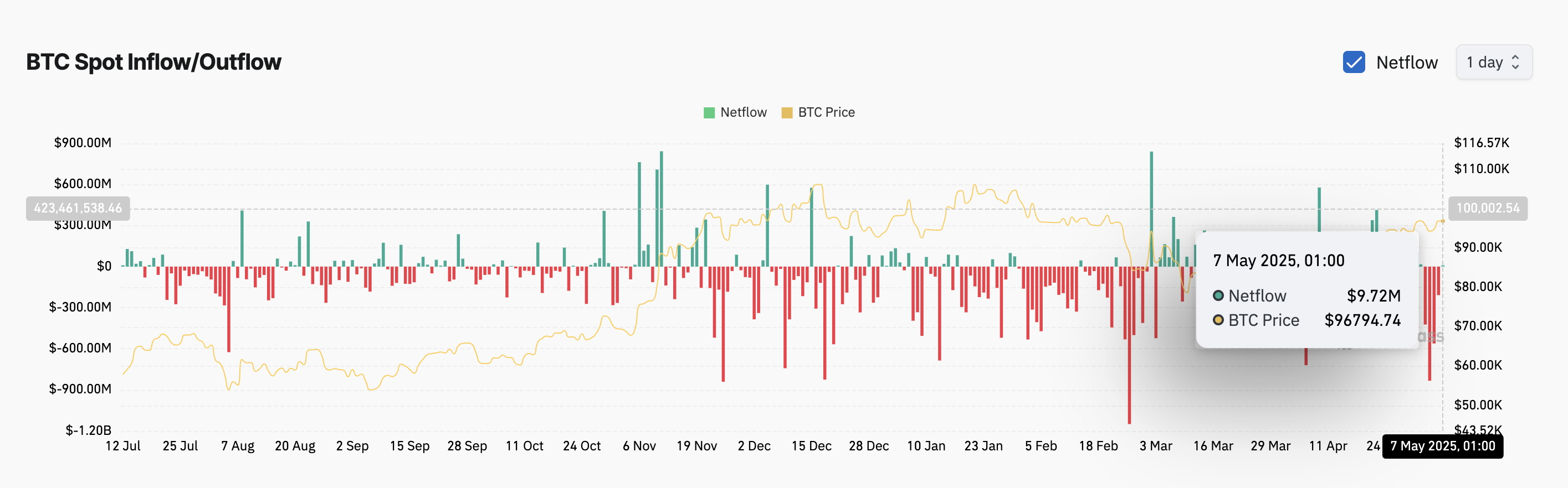Volgens Coinglass bedraagt de spot netto-instroom van BTC $9,72 miljoen. Wanneer een asset spot instromen ziet, is het aantal van zijn coins of tokens dat is gekocht en verplaatst naar spotmarkten toegenomen, wat wijst op stijgende vraag.