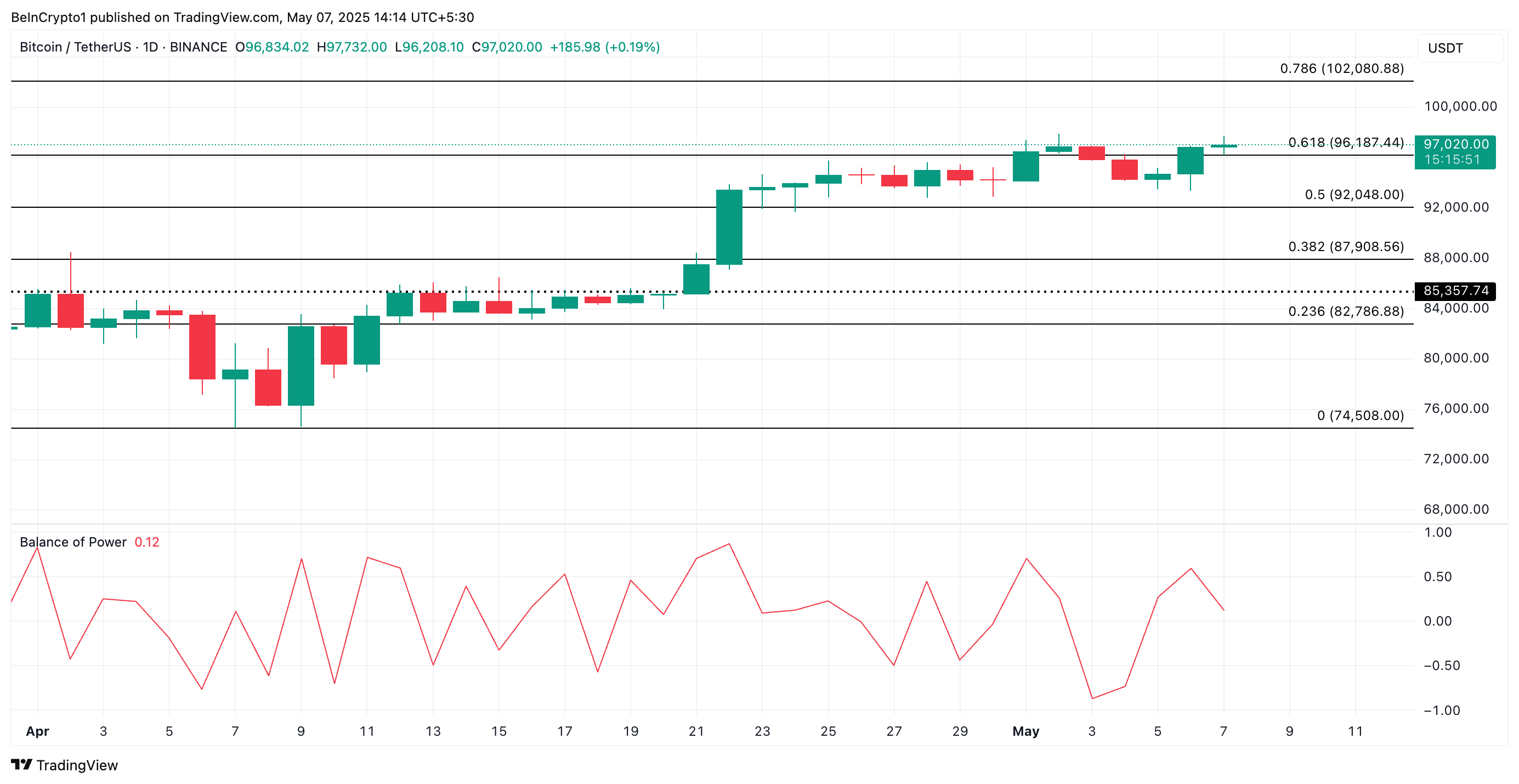 BTC handelt op $96.679 op het moment van schrijven, met een stijging van 2% in de afgelopen dag. De positieve Balance of Power (BoP) van de coin weerspiegelt de gestage stijging in spot koopactiviteit voorafgaand aan de FOMC-vergadering. Op dit moment staat deze op 0,10.