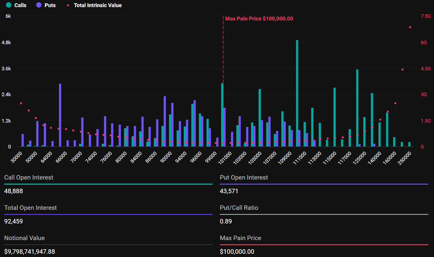 Deze aflopende Bitcoin-opties hebben een maximum pijnprijs van $100.000 en een put-to-call ratio van 0,89. Dit duidt op een over het algemeen bullish sentiment ondanks de recente terugval van de cryptomunt.