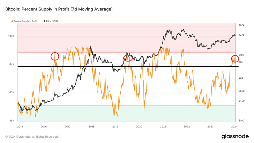 De Percent Supply in Profit (PSP) indicator geeft aan hoeveel van het totale aanbod winstgevend is. Natuurlijk benadert het 100% zodra de koers van een asset zijn all-time high nadert en bereikt het 100% zodra het zijn all-time high doorbreekt.
