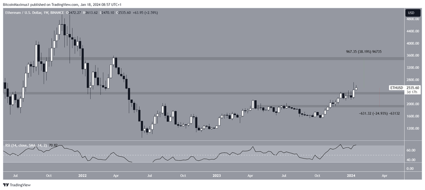 In tegenstelling tot BTC is de koersbeweging voor ETH niet zo bearish. Dit komt omdat ETH uitbrak uit de $2.350 horizontale zone, die soms fungeerde als zowel steun als weerstand sinds mei 2021. Bovendien bereikte de koers een wekelijkse sluiting boven dit niveau.