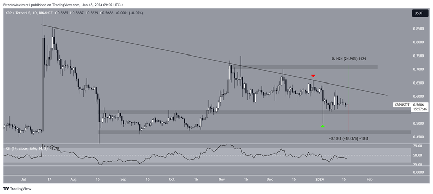 De koersactie laat zien dat XRP sinds juli onder een dalende weerstandstrendlijn is gezakt. Onlangs veroorzaakte de trendlijn een afwijzing op 28 december 2023. Sindsdien heeft de koers van XRP de trendlijn niet meer bereikt.
