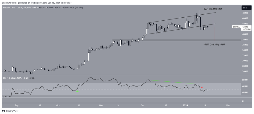 De koers van BTC sluit aan bij deze bearish ontwikkeling. Het dagelijkse tijdsframe laat zien dat BTC is gedaald sinds het bereiken van een high van $48.970 op 11 januari 2024. De daling veroorzaakte de volgende dag een uitbraak uit een stijgend parallel kanaal. Bitcoin valideert het kanaal als weerstand.