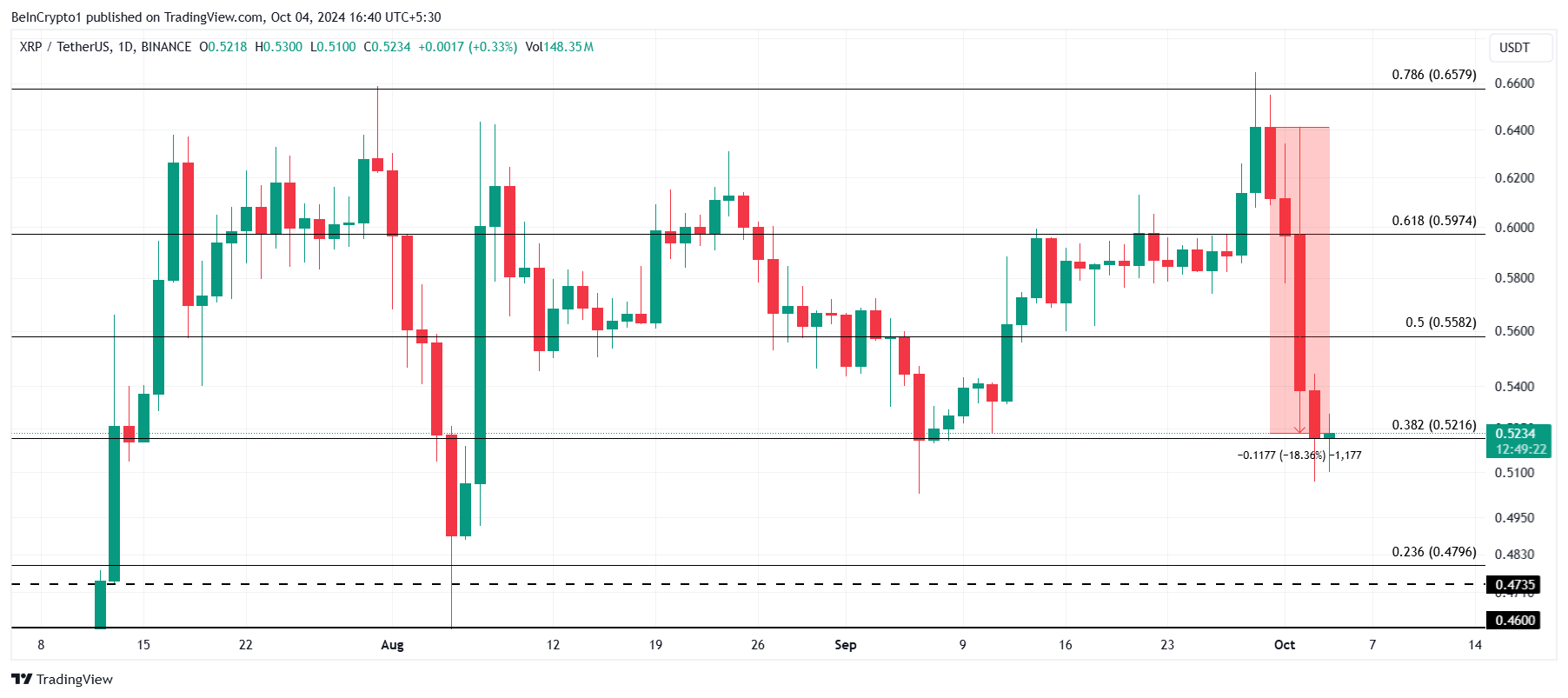 Een stuiter van dit steunniveau kan XRP naar de 50% Fibonacci lijn op $0,55 duwen. Het doorbreken van dit sleutelniveau is essentieel voor XRP om momentum terug te winnen en te herstellen van de recente verliezen.