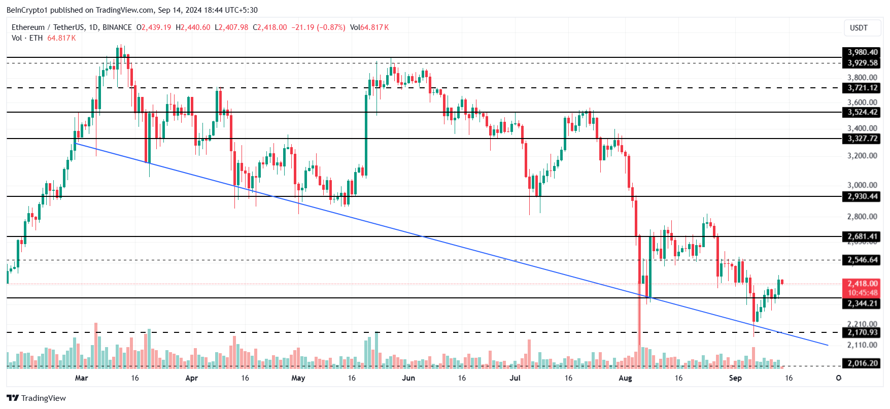 Ethereum wordt momenteel verhandeld op $2.418, na een herstel vanaf de steun op $2.344. Deze cruciale steunvloer, die voor het laatst in augustus werd getest, leidde toen tot een sprong van de altcoin koning naar $2.681. Een vergelijkbare beweging wordt de komende dagen opnieuw verwacht voor ETH.