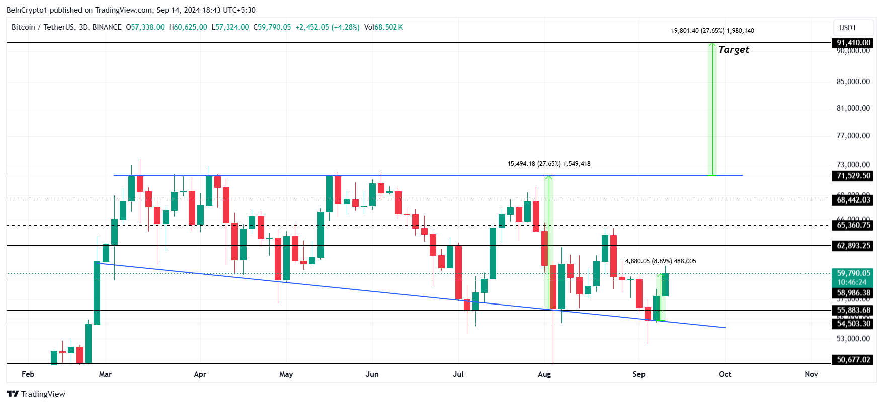 Echter, een conservatiever doel ligt bij de bovenste trendlijn op $71.600, wat een realistischer kortetermijndoel is. Bitcoin herstelde recent vanaf de onderste trendlijn, en het omzetten van $60.000 in een solide steunniveau is essentieel om de opwaartse trend te behouden.