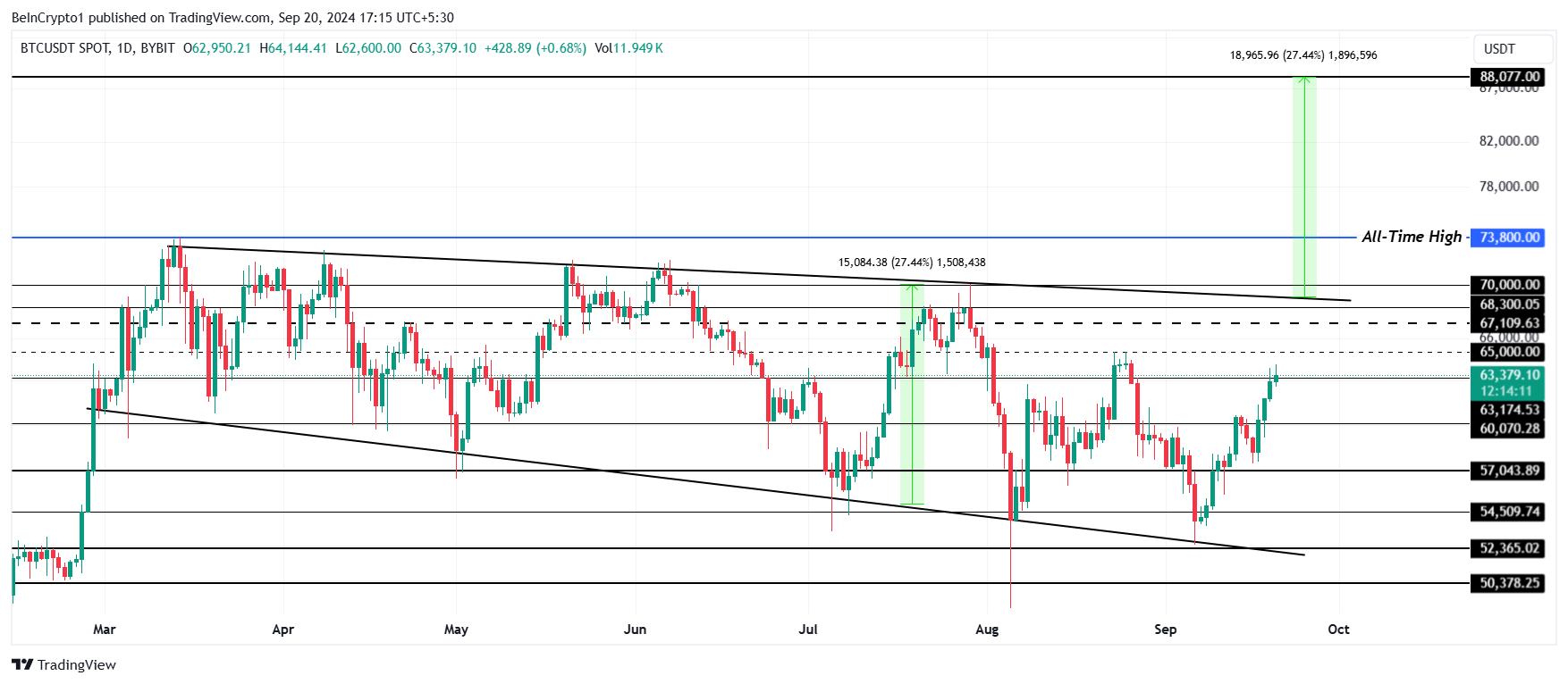 Echter, als Bitcoin er niet in slaagt $65.000 te doorbreken, vergelijkbaar met zijn prestaties in augustus, kan het terugvallen onder de steun van $63.174. Een verdere daling zou kunnen leiden tot BTC die de $60.000-steun test, waardoor de huidige bullish vooruitzichten ongeldig worden.