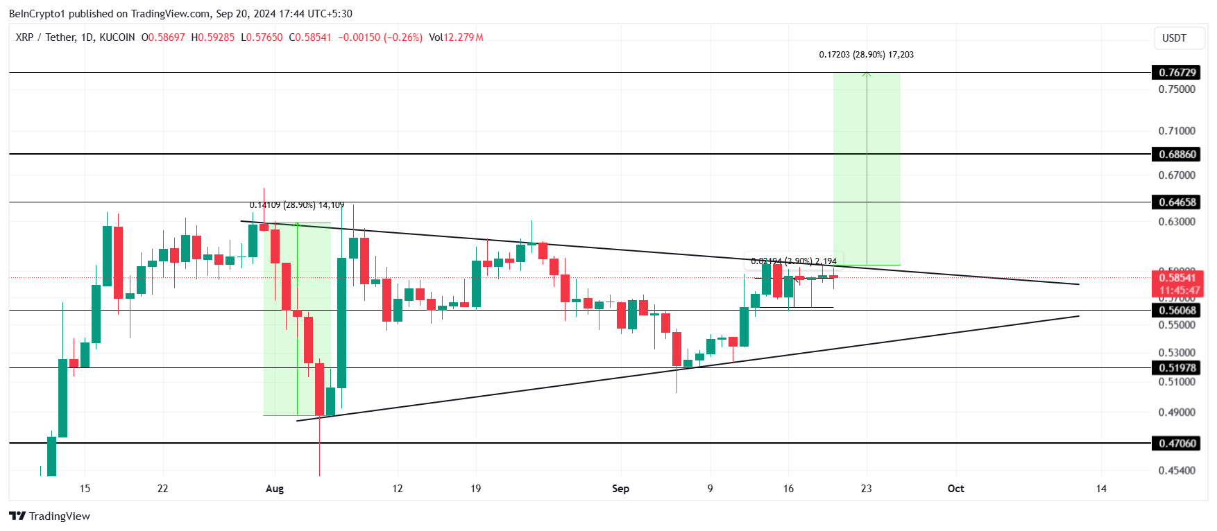 Het symmetrische driehoekspatroon suggereert een potentiële 29% rally naar $0,76 als XRP uitbreekt. Echter, voor deze rally om bevestigd te worden, moet XRP de weerstand op $0,64 omzetten in steun, wat een sterke opwaartse beweging aangeeft.
