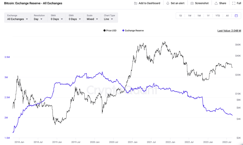 Exchange Res erves houden real-time veranderingen bij in de totale BTC-saldi van investeerders in erkende wallets van cryptobeurzen. Een daling van de Bitcoin Exchange reserves naar 2,05 miljoen coins betekent dat investeerders alleen al in augustus 2023 480.000 BTC hebben opgenomen.