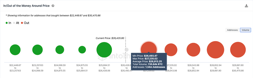 Het laat echter zien dat de Bitcoinprijs te maken zal krijgen met initiële weerstand rond het $ 27.000-gebied. Zoals hieronder te zien is, hebben de 1,34 miljoen holders 735.840 BTC gekocht tegen de maximale koers van $ 27.200. Als ze vroeg winst boeken, zou de koers van BTC een bearish reversal kunnen ingaan.