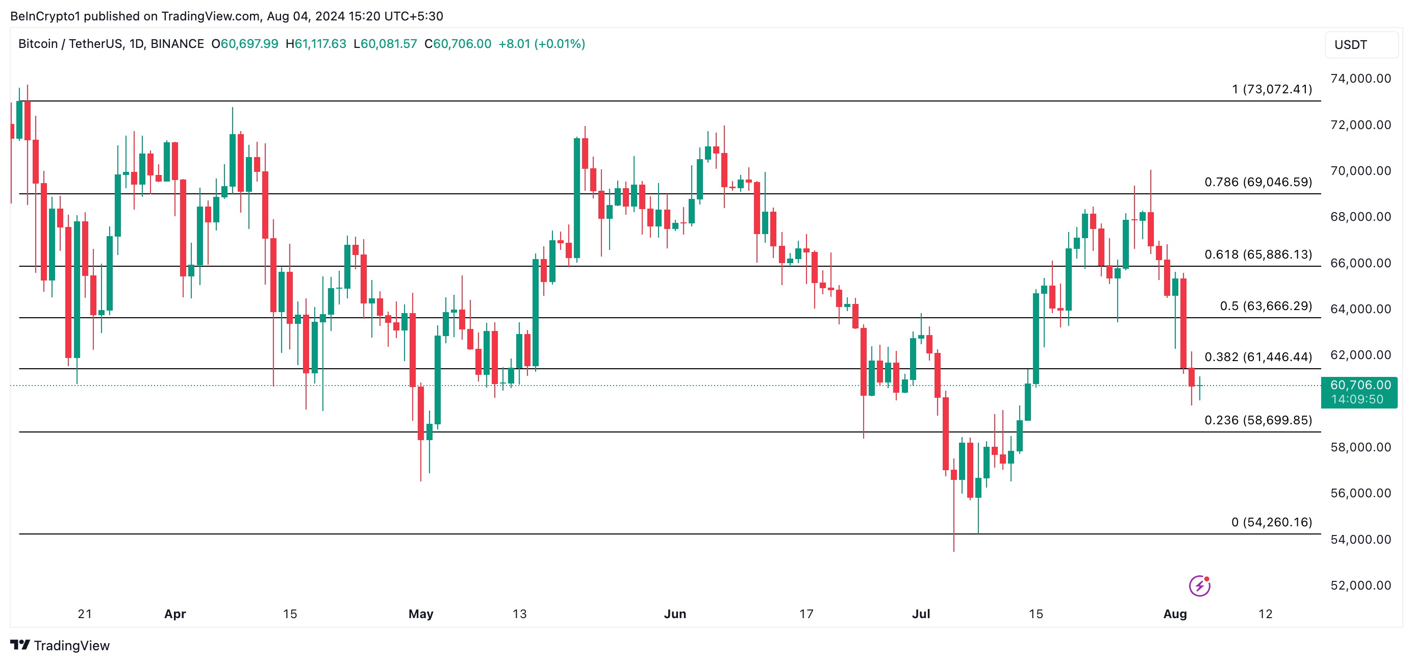 Volgens de Fibonacci Retracement niveaus van de coin, als de huidige neerwaartse trend aanhoudt, is het volgende prijsdoel van BTC $58,699. Echter, als het een opwaartse trend ervaart, zal zijn prijs stijgen naar $61,466.