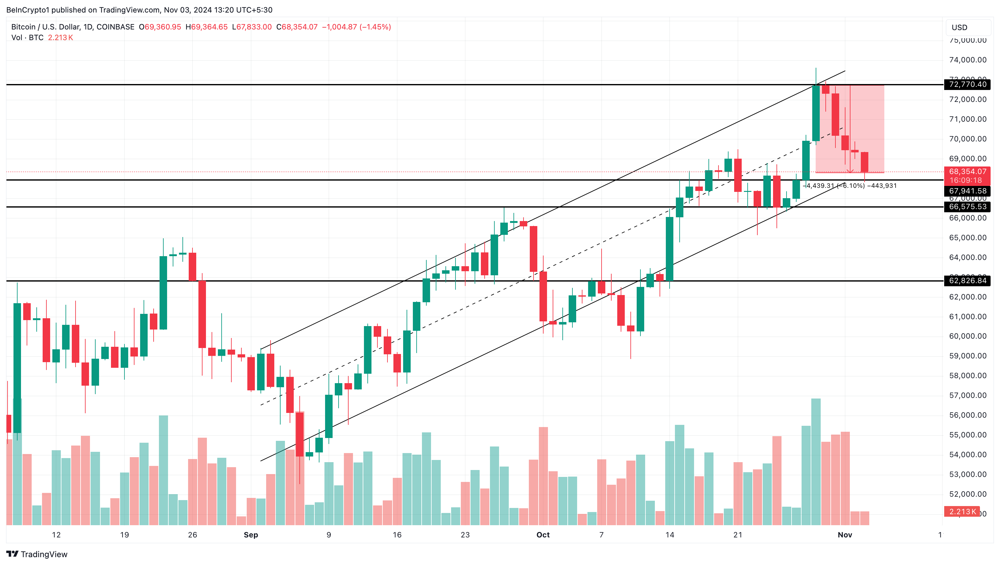 Als BTC onder deze ondersteuning valt, kan het dalen naar $66.575, met een verdere daling naar $62.826 in een meer bearish scenario.
