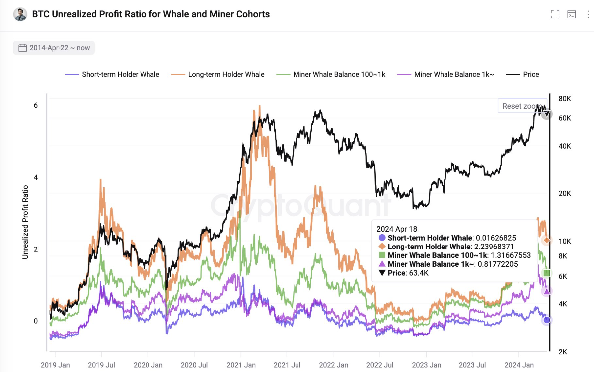 Ki Young Ju, CEO van CryptoQuant, tweette dat het historische patroon van langere holdingperiodes rond halvings een sterk holder-sentiment suggereert. Dit gedrag komt overeen met de algemene verwachting dat verminderd aanbod, als gevolg van de halvings en aanhoudende of toegenomen vraag, de koers zal opdrijven. Ju merkt op dat ongerealiseerde winsten, voor met name miners en whales, positief blijven.
