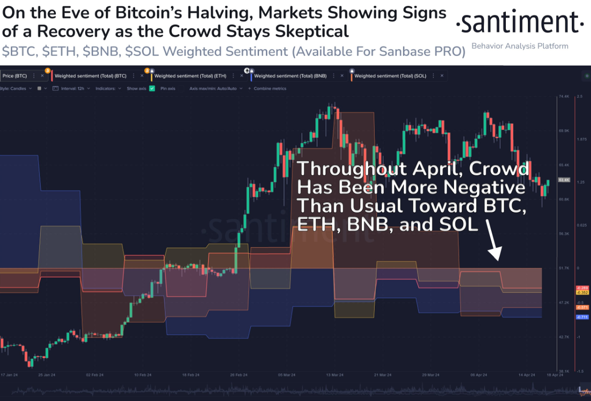 Santiment’s analyse geeft ook aan dat de algemene consensus bearish blijft, ondanks dat Bitcoin op 18 april $63.800 bereikte. Santiment merkt echter op dat dit kan worden gezien als een teken van een potentieel herstel.