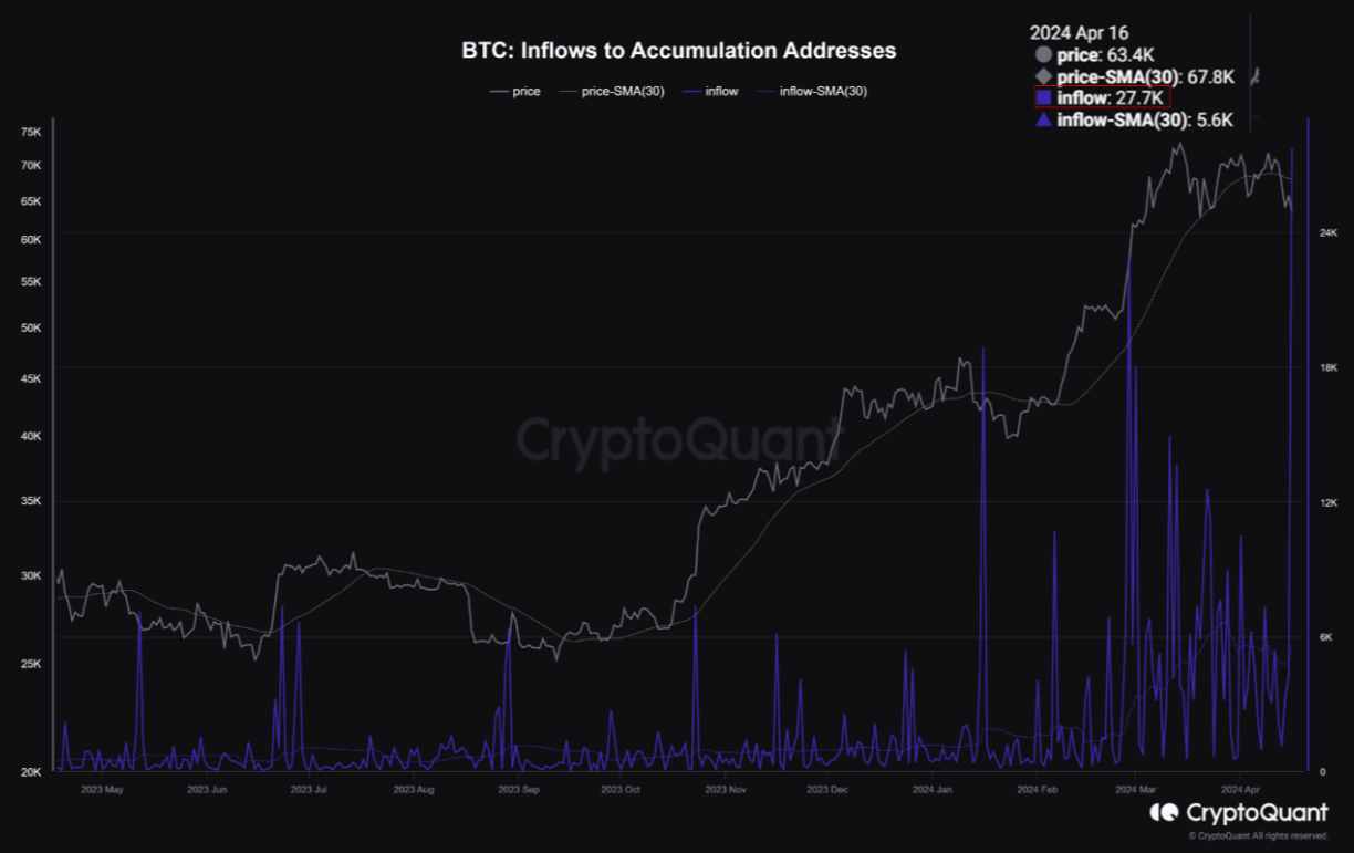 De instroom van Bitcoin op accumulatieadressen bereikte een nieuwe all-time high op 18 april.
