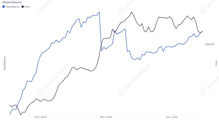 IntoTheBlock biedt meer inzicht en laat zien dat grootschalige holders (1.000 BTC+) hun holdings in de afgelopen zeven dagen met 16.300 BTC hebben verhoogd – gelijk aan $1 miljard tegen de huidige koers. De grootste whales moeten echter nog beginnen met kopen.