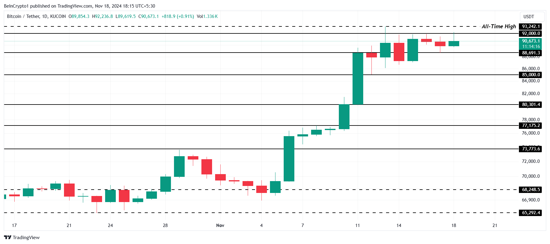 Daarentegen kan een stuitering vanaf $88.691 en een succesvolle doorbraak van de weerstand op $92.000 het bullish momentum nieuw leven inblazen. Dit zou Bitcoin in staat stellen om een nieuwe all-time high boven $93.242 na te streven, waardoor zorgen over een omkering effectief worden weggenomen en de langetermijn opwaartse traject wordt versterkt.