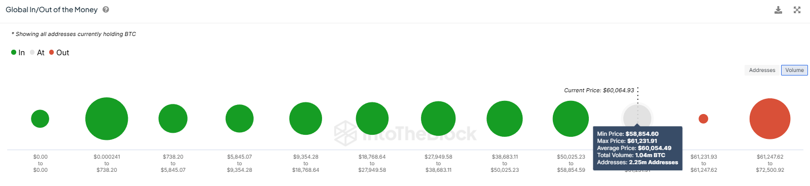 Het macro-momentum van Bitcoin toont veelbelovende signalen, vooral met de Global In/Out of the Money (GIOM) indicator. Deze indicator laat zien dat 1,04 miljoen BTC, met een waarde van meer dan $62 miljard, winstgevend zou worden als Bitcoin $61.725 weet te doorbreken.