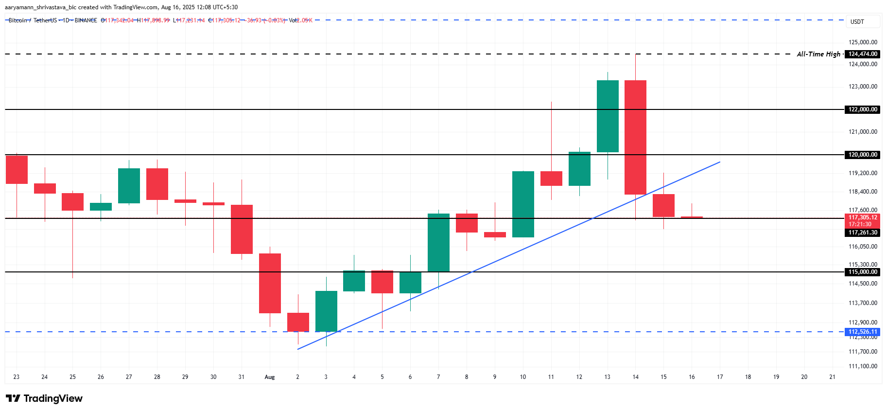 Bitcoin koers vertoonde de hele maand een opwaartse trend, maar dit momentum verzwakte in de laatste 24 uur, waarbij BTC daalde naar $117.305. Deze daling vond plaats toen de koers onder de gevestigde opwaartse trendlijn zakte, wat wijst op een verandering in het marktsentiment.