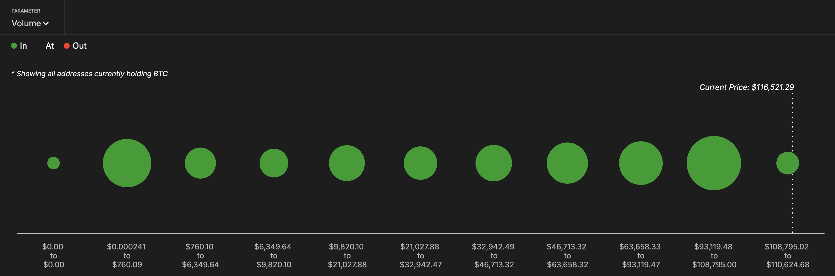 In mei stortte de koers in omdat steunzones snel braken. Deze keer, als Bitcoin boven dit adrescluster blijft, betekent dit dat korte-termijn kopers nog steeds op winst zitten. Dit versterkt de overtuiging dat de prijs sterke steun heeft en de opwaartse trend kan voortzetten.