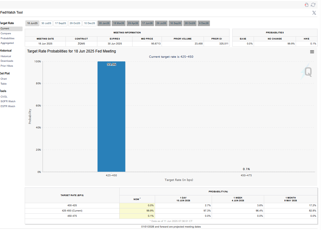 Volgens de CME FedWatchTool is er een kans van 99,9% dat de Fed de rentetarieven stabiel houdt op 4,25-4,50% in de volgende vergadering, wat momenteel vrijwel geen kans op renteverlagingen door de Fed betekent.