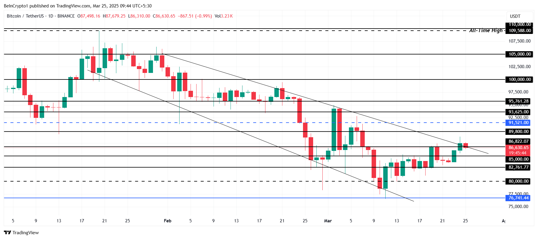 Bitcoin handelt momenteel op $86.630 en breekt uit een dalend wigpatroon. De koers probeert $86.822 als steun te beveiligen, wat cruciaal zal zijn voor de volgende stap van BTC. Als de steun standhoudt, kan Bitcoin zijn opwaartse traject voortzetten richting het weerstandsniveau van $89.800.