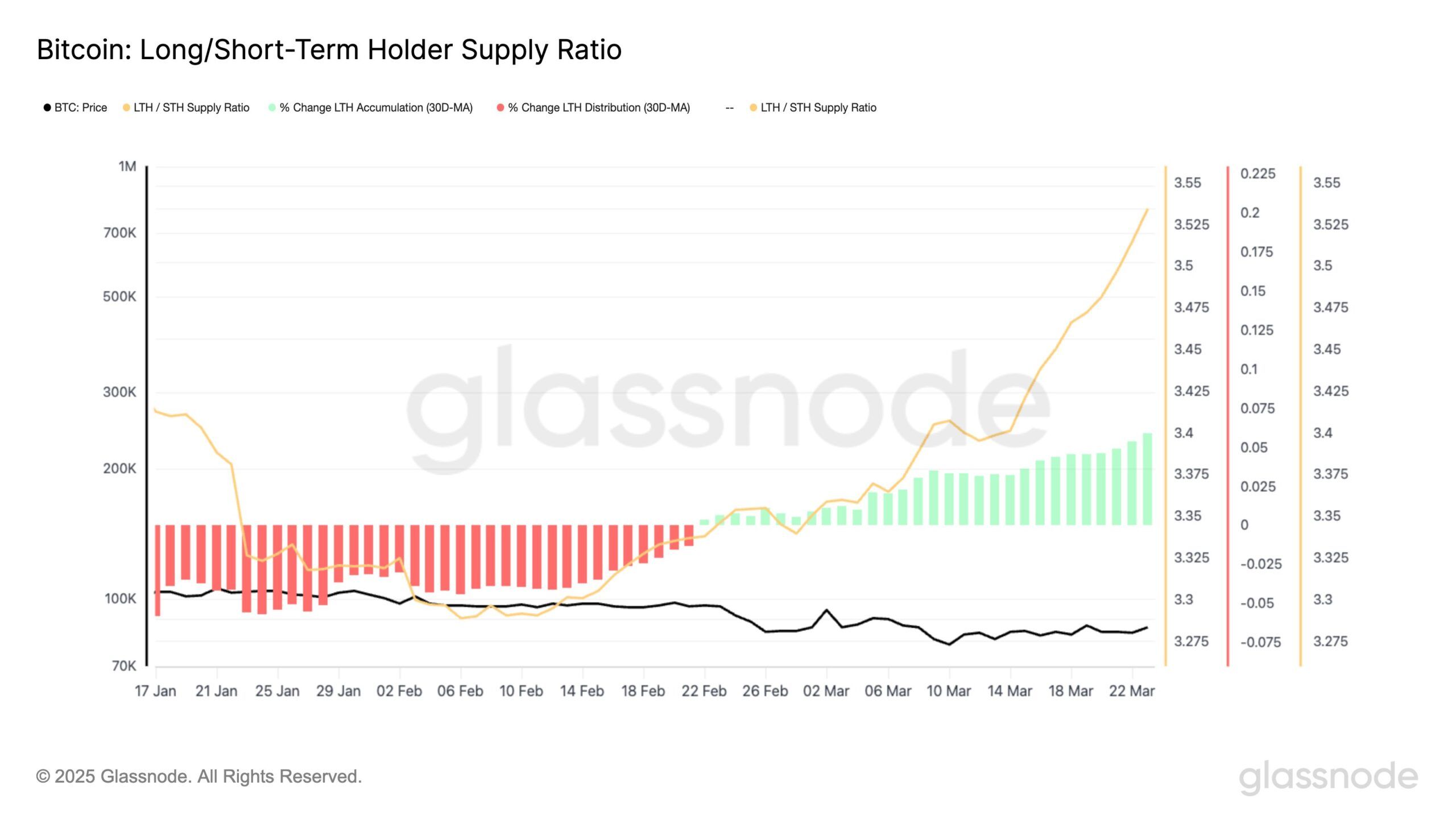 Long/Short Term Holder Supply Ratio heeft sinds eind februari aanzienlijke groei laten zien, wat duidt op een positieve verschuiving in het gedrag van investeerders. Lange-termijn houders (LTH’s) zijn gestaag aan het accumuleren, met een 30-daags accumulatiepercentage dat nu bijna 6% bereikt. Het tempo van deze verandering is ook versneld, met een gemiddelde van 7% per dag sinds eind februari.