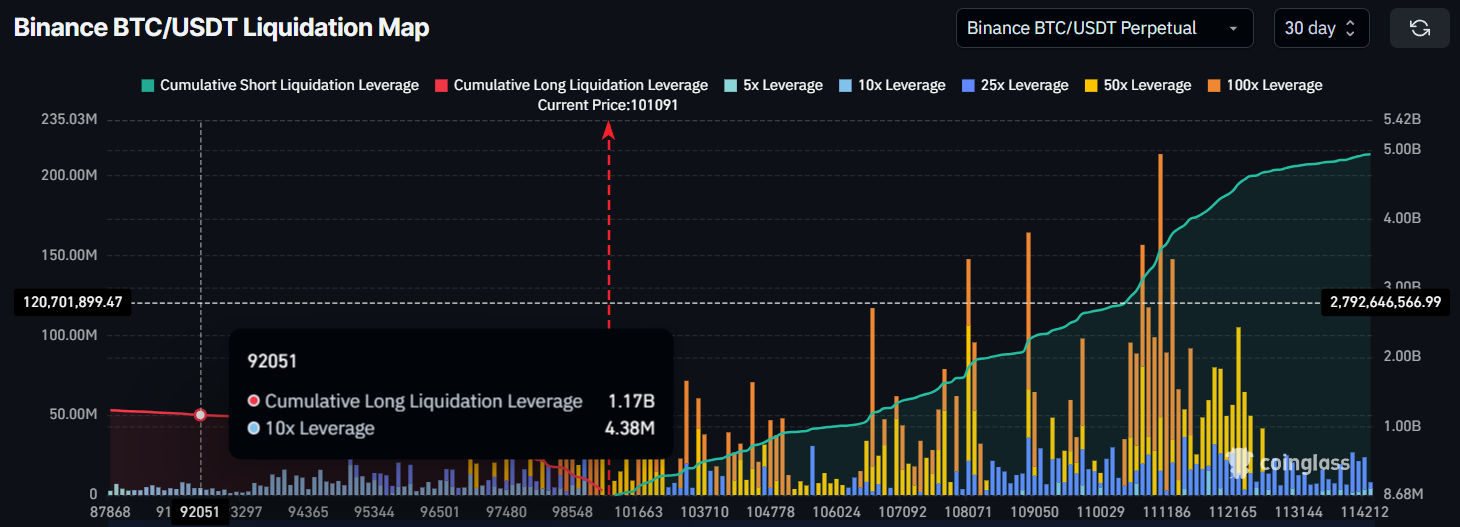 Bovendien geeft de Bitcoin-liquidatiekaart aan dat er meer dan $1,17 miljard aan long-liquidaties kunnen plaatsvinden als de Bitcoin koers daalt naar $92.000. Deze mogelijke liquidatiepiek suggereert een aanzienlijk risico voor degenen met longposities.