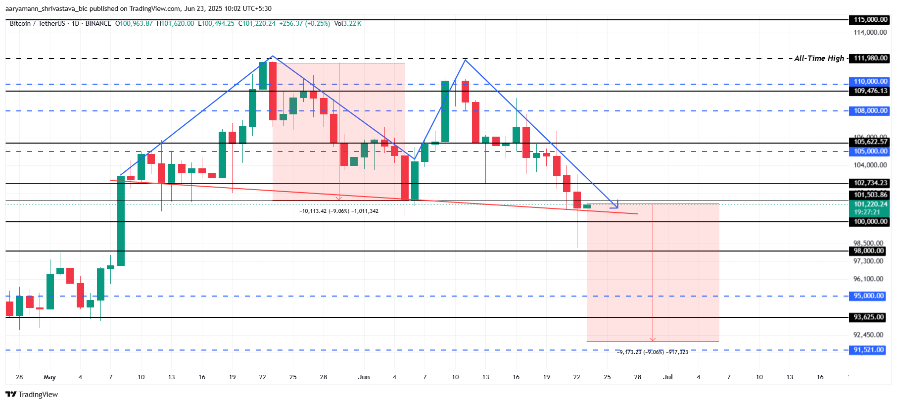 Het patroon houdt momenteel stand boven $100.000, maar een daling onder dit cruciale niveau zou de bearish setup bevestigen. Als de Bitcoin koers onder $98.000 breekt, kan dit waarschijnlijk een crash naar $92.000 veroorzaken, wat een daling van 9% betekent. Dit zou verdere verkopen uitlokken en de bearish Bitcoin verwachting op korte termijn versterken.