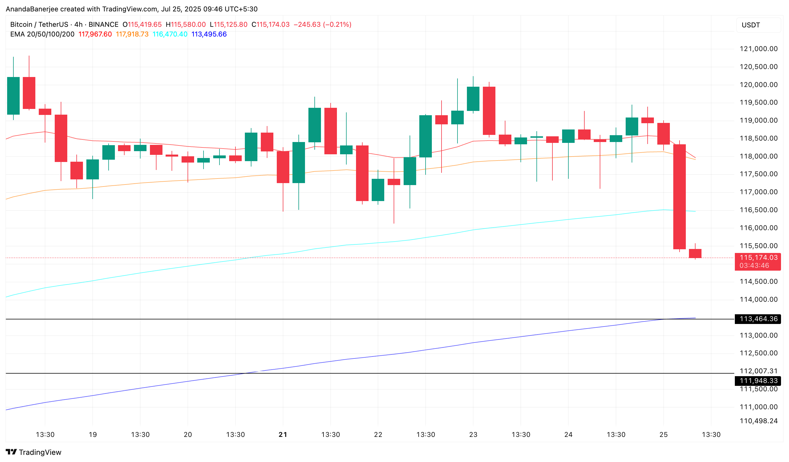 De volgende belangrijke steun is de 200-periode EMA (blauwe lijn) op de 4-uur grafiek, momenteel rond $113.000. Deze EMA-lijn komt ook overeen met een belangrijk steunniveau, dat in het volgende gedeelte wordt onthuld.