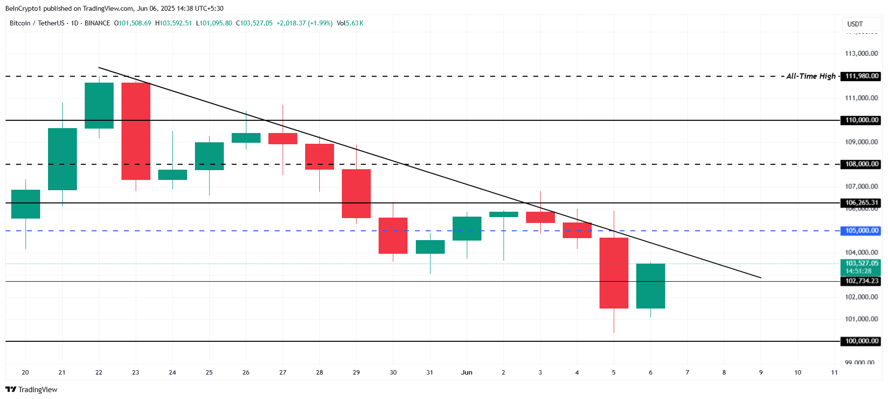 Als de Bitcoin koers blijft falen in het doorbreken van de neerwaartse trend, zou het kunnen dalen naar $100.000. Een langdurige neerwaartse trend, gecombineerd met het gebrek aan sterke koopkracht, suggereert dat de daling zou kunnen aanhouden, mogelijk richting $98.000.