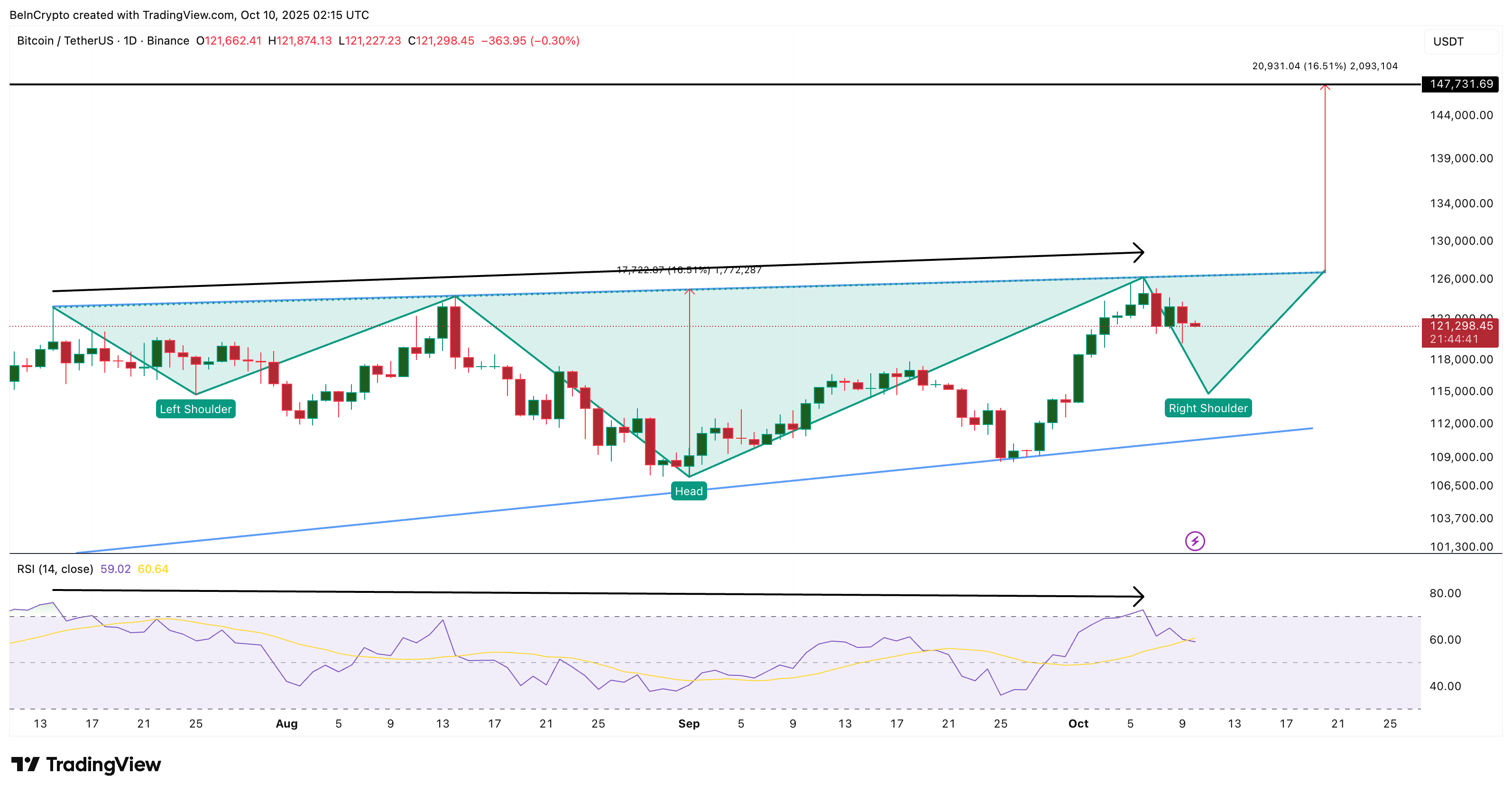 Bitcoin’s bredere structuur blijft gericht op een koersdoel van ongeveer $147.700, gebaseerd op de huidige technische setup. Voor die opwaartse beweging moet de markt echter eerst stabiliseren en overtuigend uitbreken boven $126.100, het all-time high dat samenvalt met de neklijn van het lopende ‘inverse head and shoulders’-patroon.