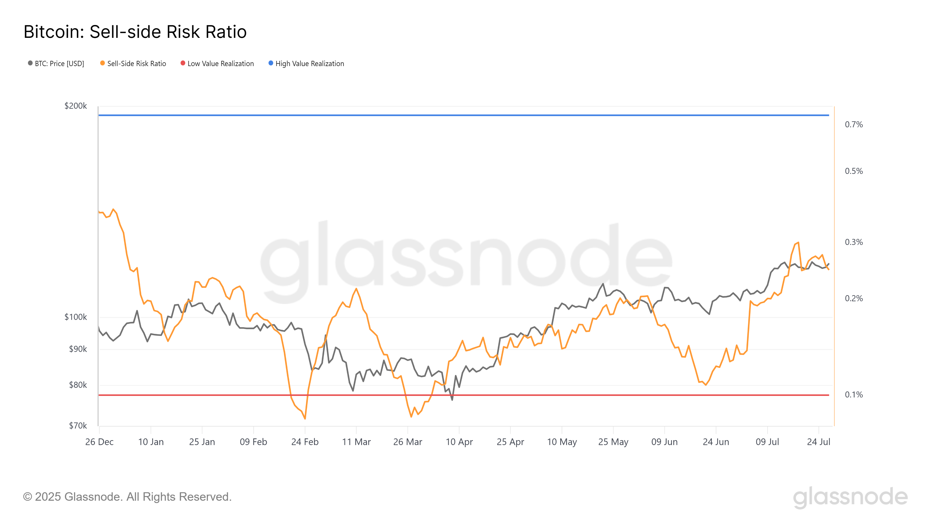 Bitcoin’s huidige sell-side risicoratio is 0,24, een 6-maandse high. Het ligt echter ruim onder de neutrale drempel van 0,4 en dichter bij de realisatiedrempel van 0,1. Dit wijst op marktconsolidatie, waarbij het gedrag van investeerders suggereert dat grote verkopen even pauzeren.