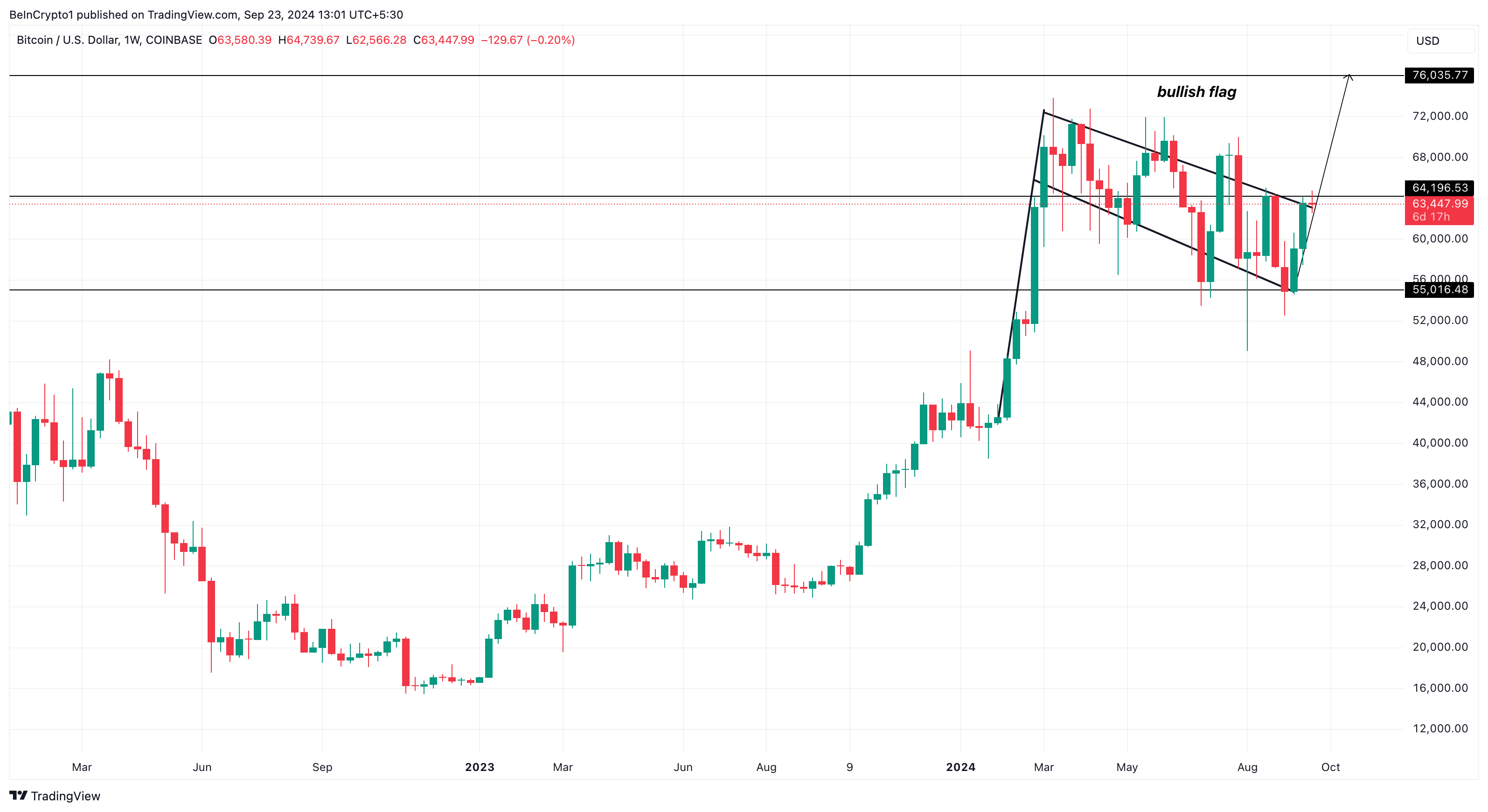 Op de wekelijkse grafiek heeft de recente stijging van Bitcoin geleid tot de vorming van een bullish flag-patroon. De steile stijging vormt de “flagpole”, gevolgd door een korte consolidatie tussen twee parallelle trendlijnen, wat wijst op een mogelijke voortzetting van de opwaartse trend.