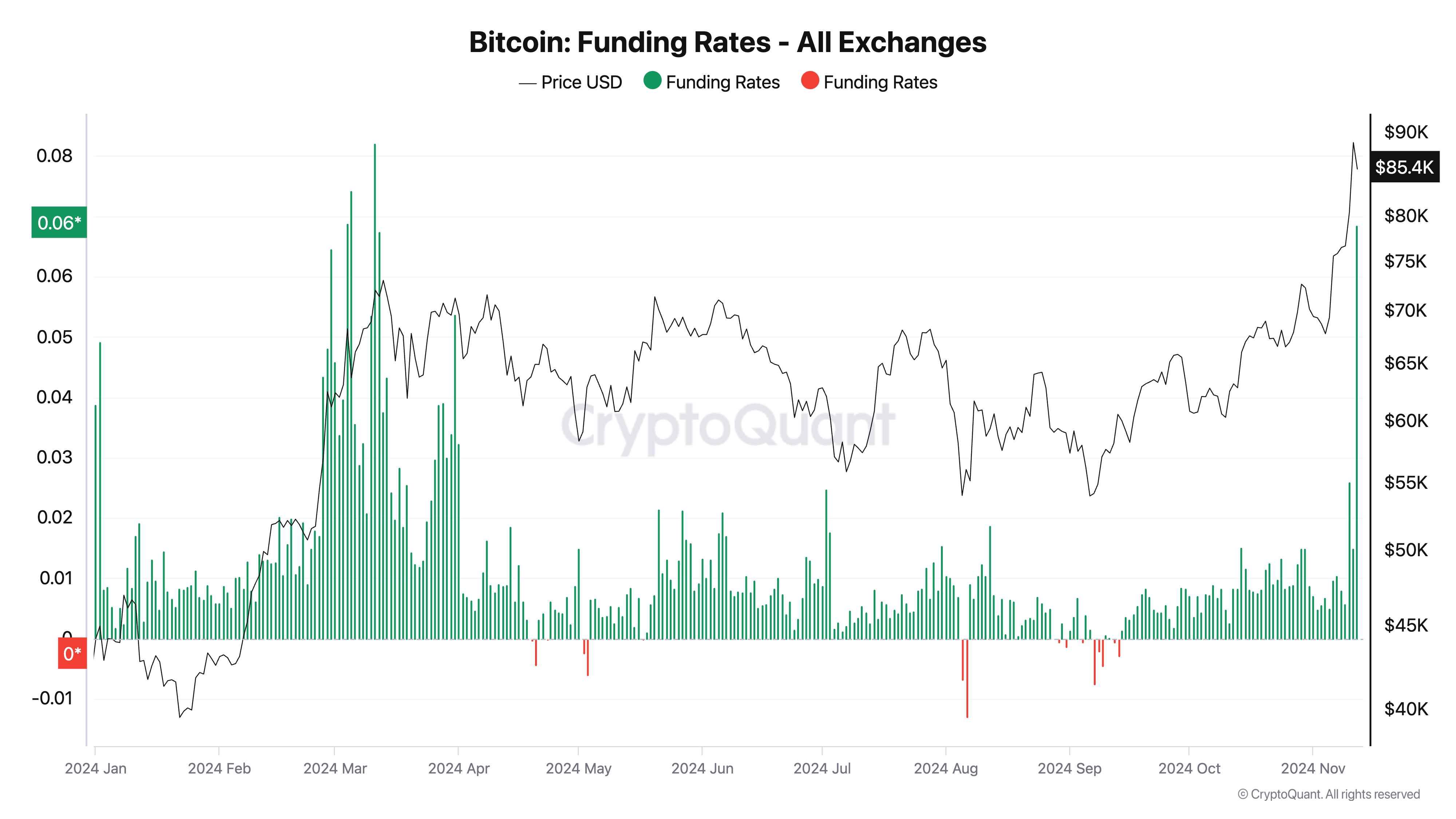 De exploderende open interest van Bitcoin is een sleutelfactor die de stijging naar de $90.000 op korte termijn kan belemmeren. Volgens gegevens van CryptoQuant is er in de afgelopen week meer dan $16 miljard toegevoegd aan open posities in de futuresmarkt. Dit markeert een aanzienlijke toename in leverage. Op het moment van schrijven is de open interest van BTC $25 miljard, het hoogste sinds augustus 2022.